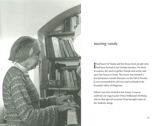 In 1986 Sandra was invited to London by Mary Stewart to show her many pupils the approach Vanda had developed in teaching yoga. 'No ambition and infinite time', she often repeated, to keep the practice utterly simple. Later, in retreats offered by Thich Nhat Hanh, Sandra discovered the walking meditation again which Vanda had practiced all along the road to Fiesole, and brought this into her practice. For more than thirty years Sandra has been teaching in Germany, England, Finland, Israel and most recently in India. She lives in Campiglia in Tuscany, a beautiful medieval village near the sea, where she holds residential courses.